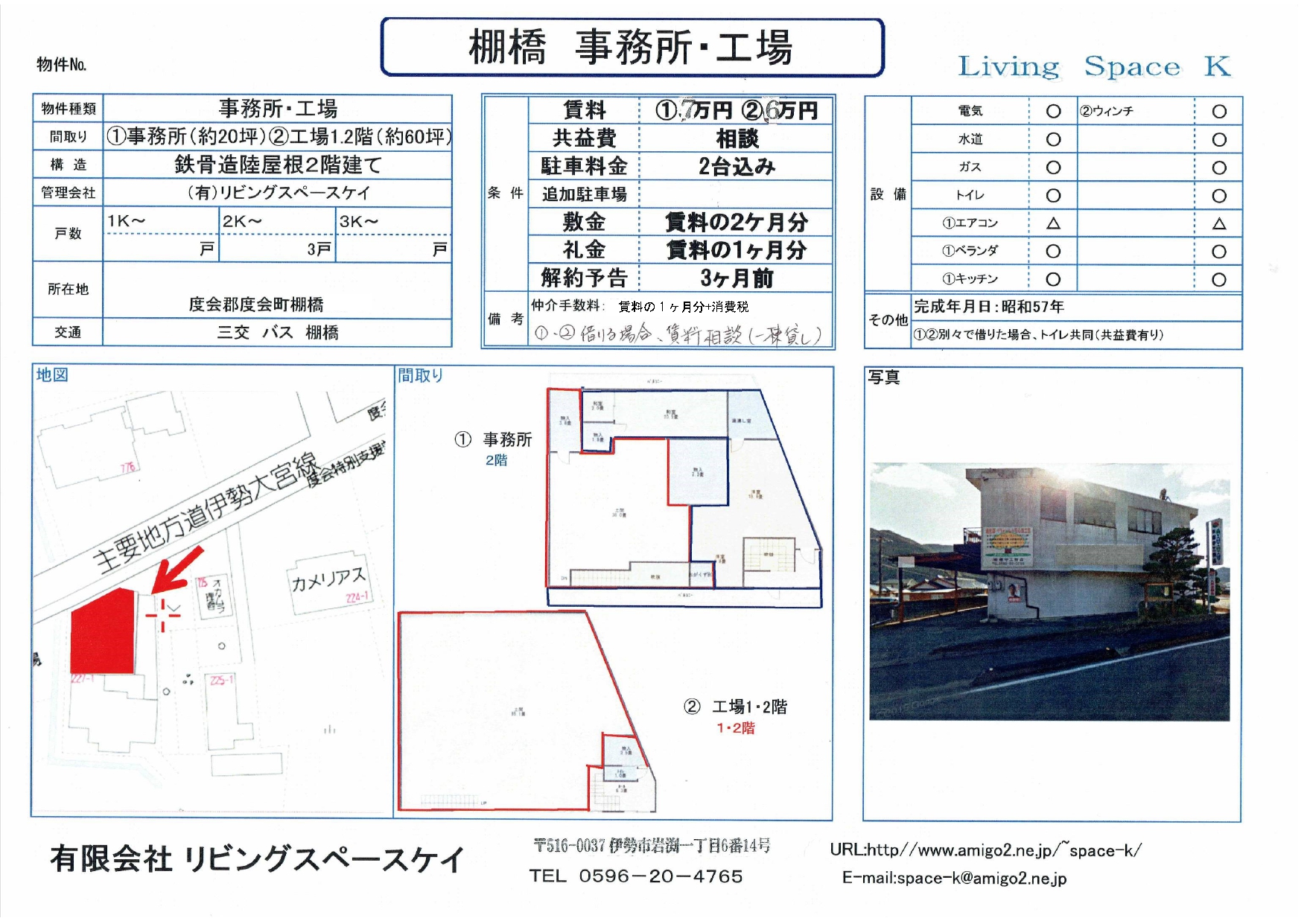 002 [事務所・工場・倉庫] 度会町棚橋 1.2階 事務所約20坪 工場約60坪